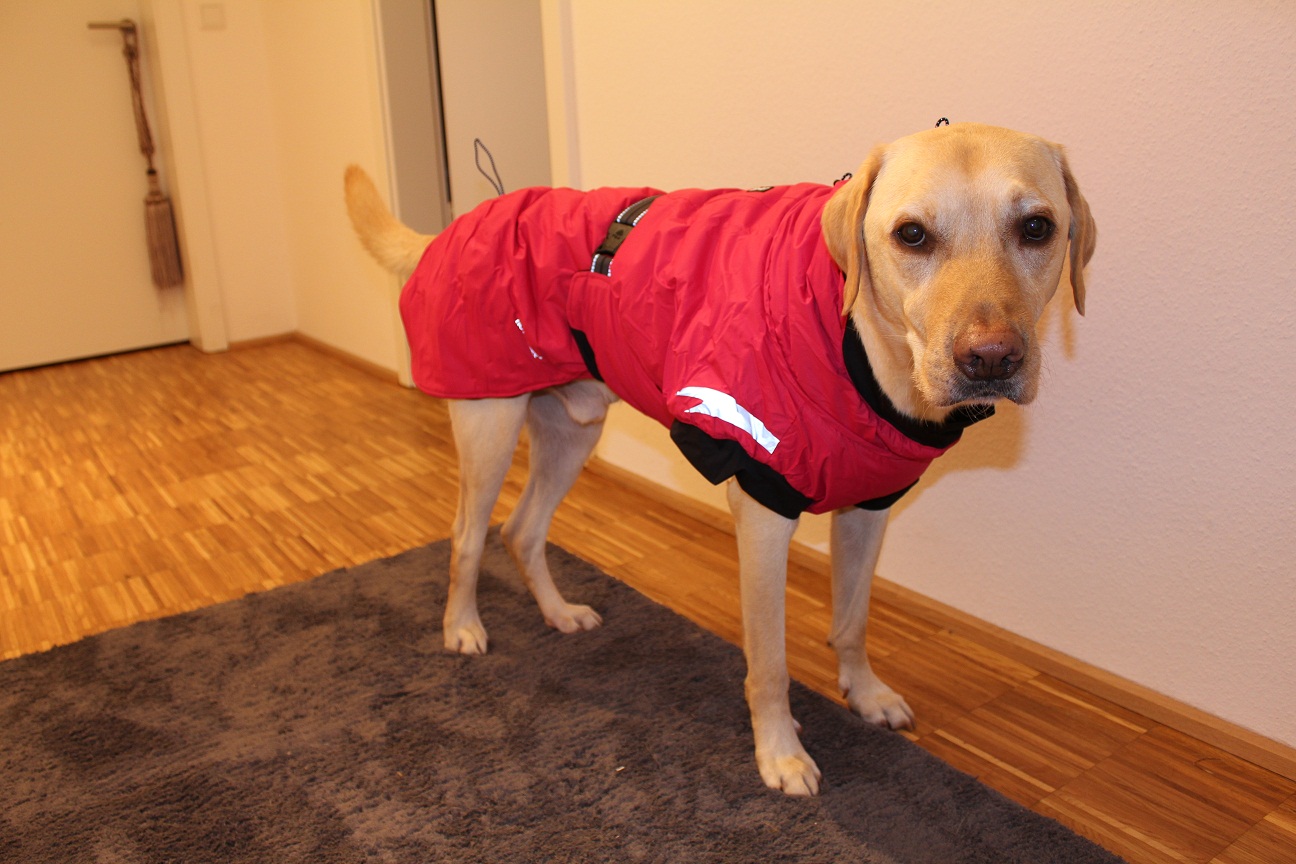 Auf jeden Fall mussten wir ganz schön suchen, bis wir den Mantel überhaupt im Internet gefunden haben. Er liegt preislich deutlich über dem von Hurtta und seine Bezeichnungen sind schon eine eigene Wissenschaft für sich. Er ist aussen aus Softface und innen aus Thermofleece. Ob er tatsächlich wasserdicht ist, sehen wir natürlich erst später.