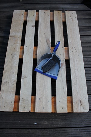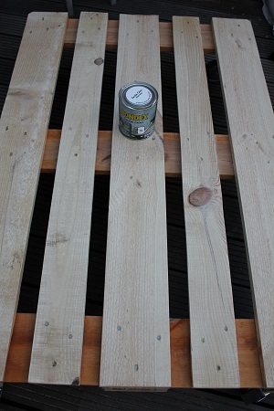 Im ersten Schritt wurde die Palette abgeschliffen. Zuerst grob, dann etwas feiner. Damit hat sie alle Splitter entfernt und alle Oberflächen und Ecken schön glatt gemacht, damit wir uns nicht verletzen können.