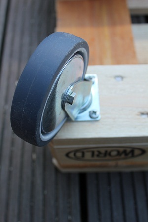Anschliessend wurden die Rollen mit Spax-Schrauben angebracht. Zwei feststellbare vorne, zwei reguläre hinten. Das mit dem Schraubenzieher hat sie übrigens nicht lange durchgehalten, sondern stattdessen den armen kleinen Akkuschrauber gequält. Ein leistungsstärkeres Gerät ist hier sicherlich von Vorteil.
