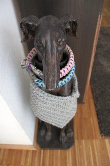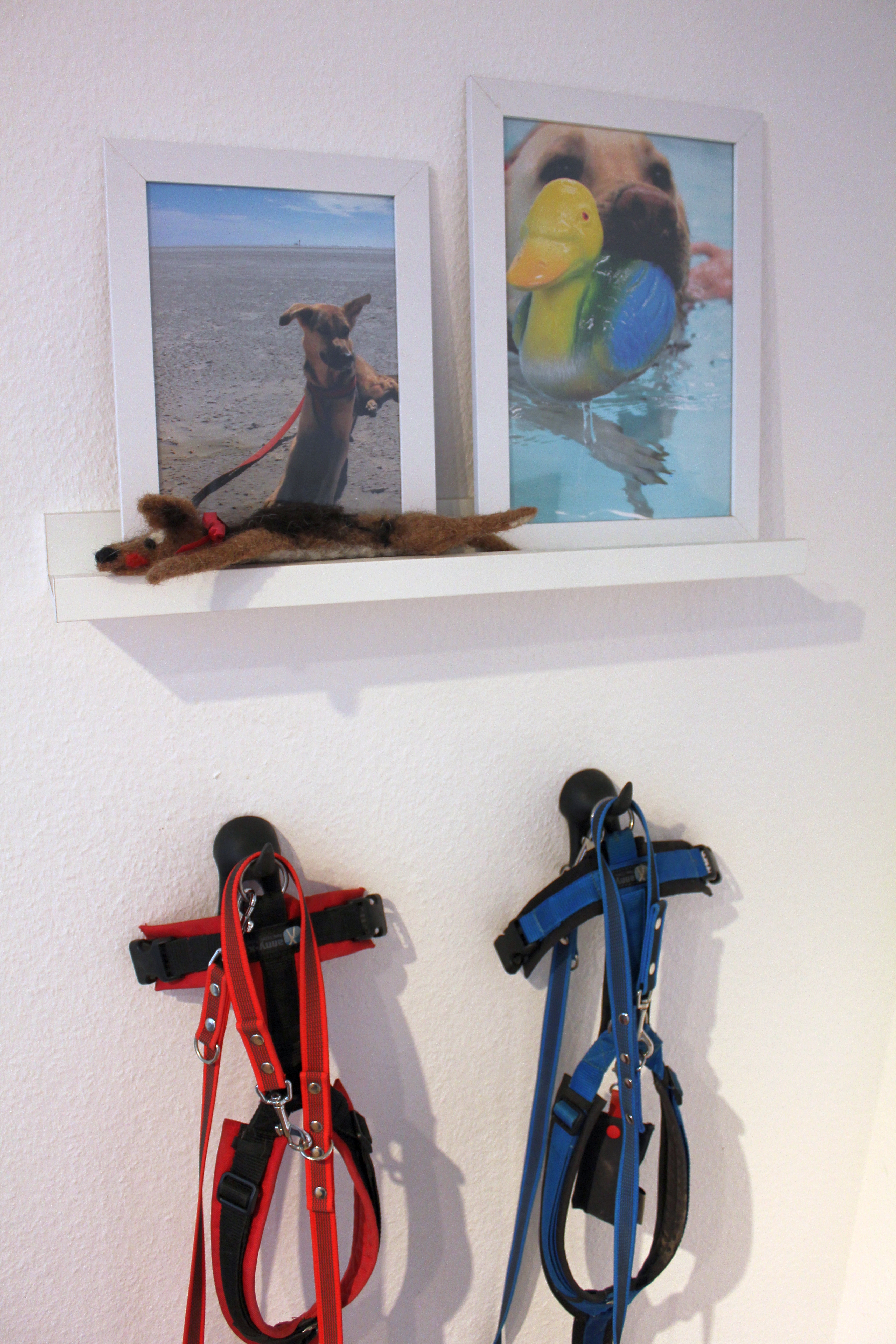 Im Eingangsbereich war uns besonders wichtig, viel Stauraum und dennoch einen netten Empfang für uns und alle Gäste zu haben. Die Geschirre, Leinen, der Bademantel und das aktuelle Pfotenhandtuch hängen an den Ikea-Hundehaken. Die Zuordnung per Foto wurde zu Beginn penibel eingehalten, mittlerweile wird eher verteilt, wo Platz ist. Besonders gut gefällt uns das gefilzte Amber-Ebenbild. Im halbhohen Schubladenschrank von Ikea verbergen sich saisonale Accessoires sowie die Sportklamotten. Gleich nebenan im Spind finden sich Ersatzhandtücher, Spielzeuge, ein Teil des Futters sowie Nahrungsergänzungsmittel. In Gedenken an meine geheime Schwäche für den britischen Kolonialstil trägt unsere stumme Freundin Lolita die Halsbänder und weiteren Accessoires solange die Rabauken das nicht tun.