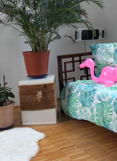 Das Gästezimmer rettet unsere Stimmung im nicht vorhandenen Sommer. Umgeben von Grün räkelt sich auf dem Gästebett doch hin und wieder der gesamte Minizoo anstelle unserer Gäste. Vor dem Bett steht ein selbstgebautes Katzenmöbel, welches gleichzeitig die Palme beherbergt und auch als Nachttisch dienen kann. Nach und nach möchte ich die hässlichen und zu meinem Leidwesen von den Katzen sehr geliebten Kratzbäume umwandeln in stylischere Einrichtungsgegenstände, die dann von den Katzen hoffentlich genauso gut angenommen werden. Bisher hat das sowohl mit dem Nachttischkratzmöbel als auch mit dem selbstgebauten Kratzbaum gut geklappt. Die Anleitungen dazu findet ihr übrigens bei reingetigert. Als nächstes sind mehrere dunkle Regale geplant, die den Katzen an unseren hohen Wänden ein echtes Kletterparadies bieten sollen.