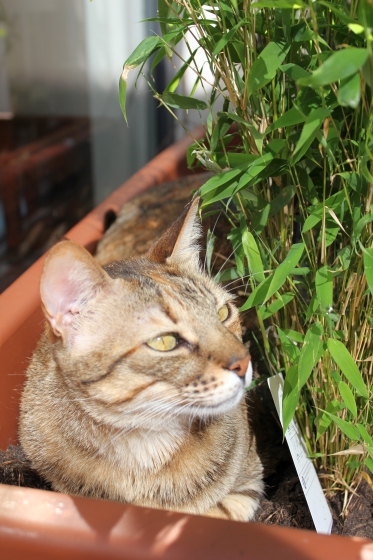 Unsere Küche ist offen und für die Rabauken natürlich ein magischer Ort, an dem immer und immer wieder versucht wird, ob nicht doch etwas abfällt. Blöderweise habe ich mich damals für Borde anstelle von Oberschränken entschieden – optisch sehr schön, in Realität leider ein Catwalk im wahrsten Sinne des Wortes. Die Miezen haben nämlich sehr schnell herausgefunden, dass die Morgensonne auf die Dunstabzugshaube scheint, die sich praktischerweise direkt über den halbhohen Kühlschrank und die offenen Borde erreichen lässt und auch noch eine perfekte Fläche zum Ausstrecken bietet – und ich hatte in meiner Naivität extra die Futternäpfe an eine ganz andere Stelle installiert, um die Tiger aus der Küche fern zu halten! Nun werde ich morgens beim ersten Sonnenstrahl mit fröhlichem Miau vom exklusiven Liegeplatz begrüßt.