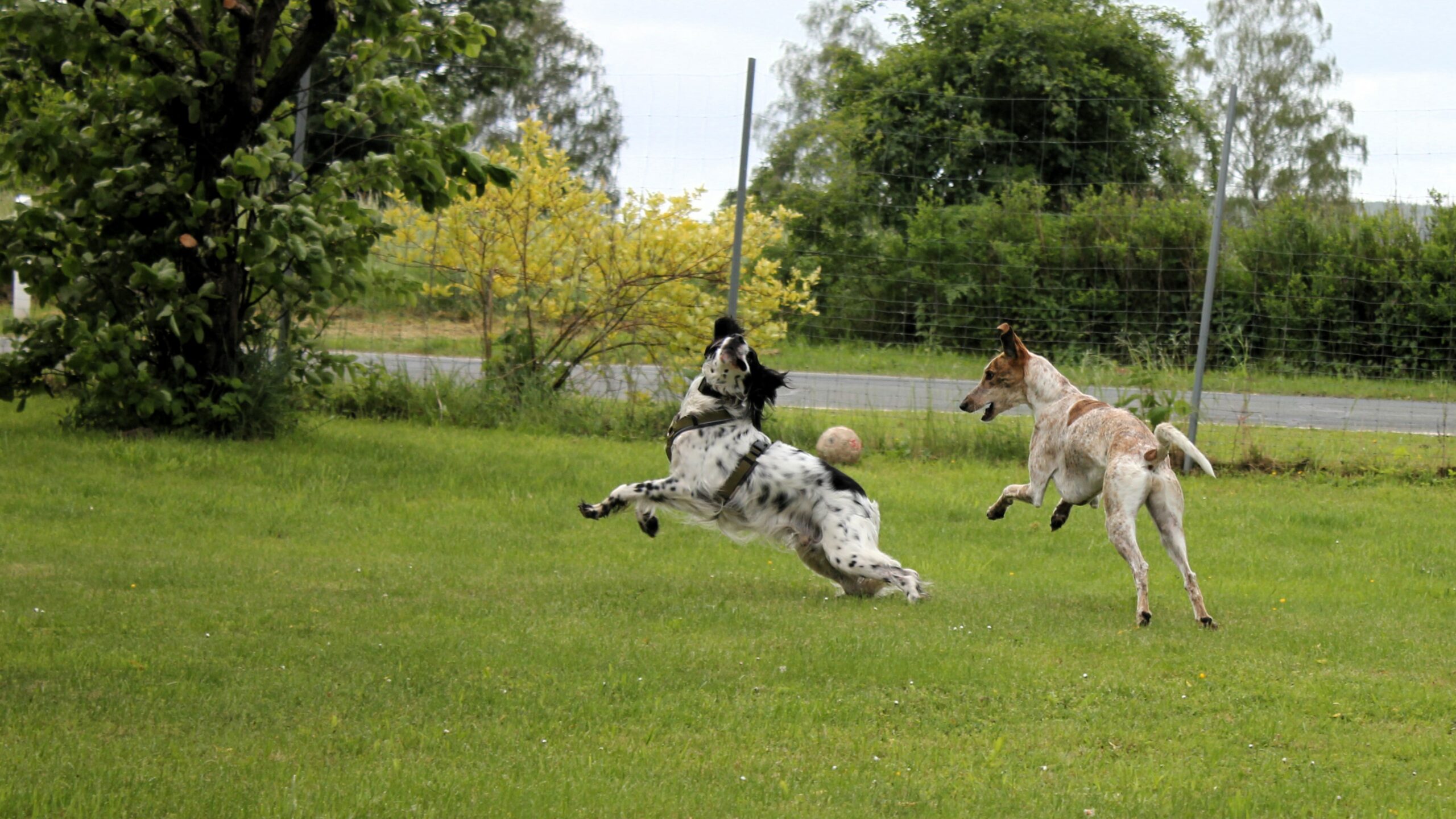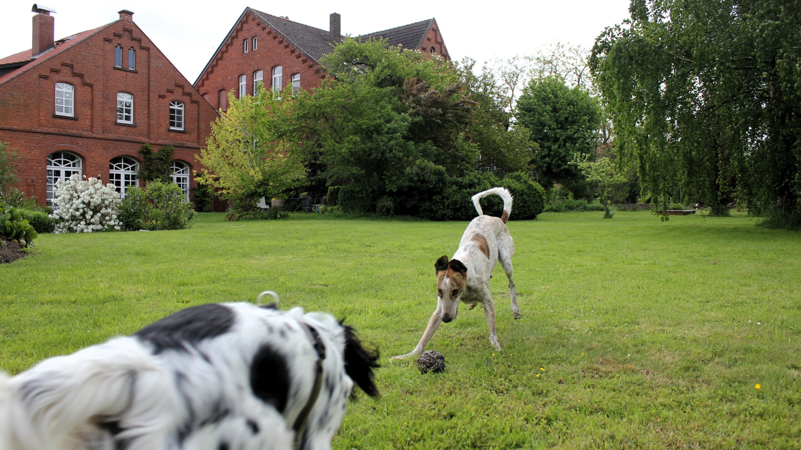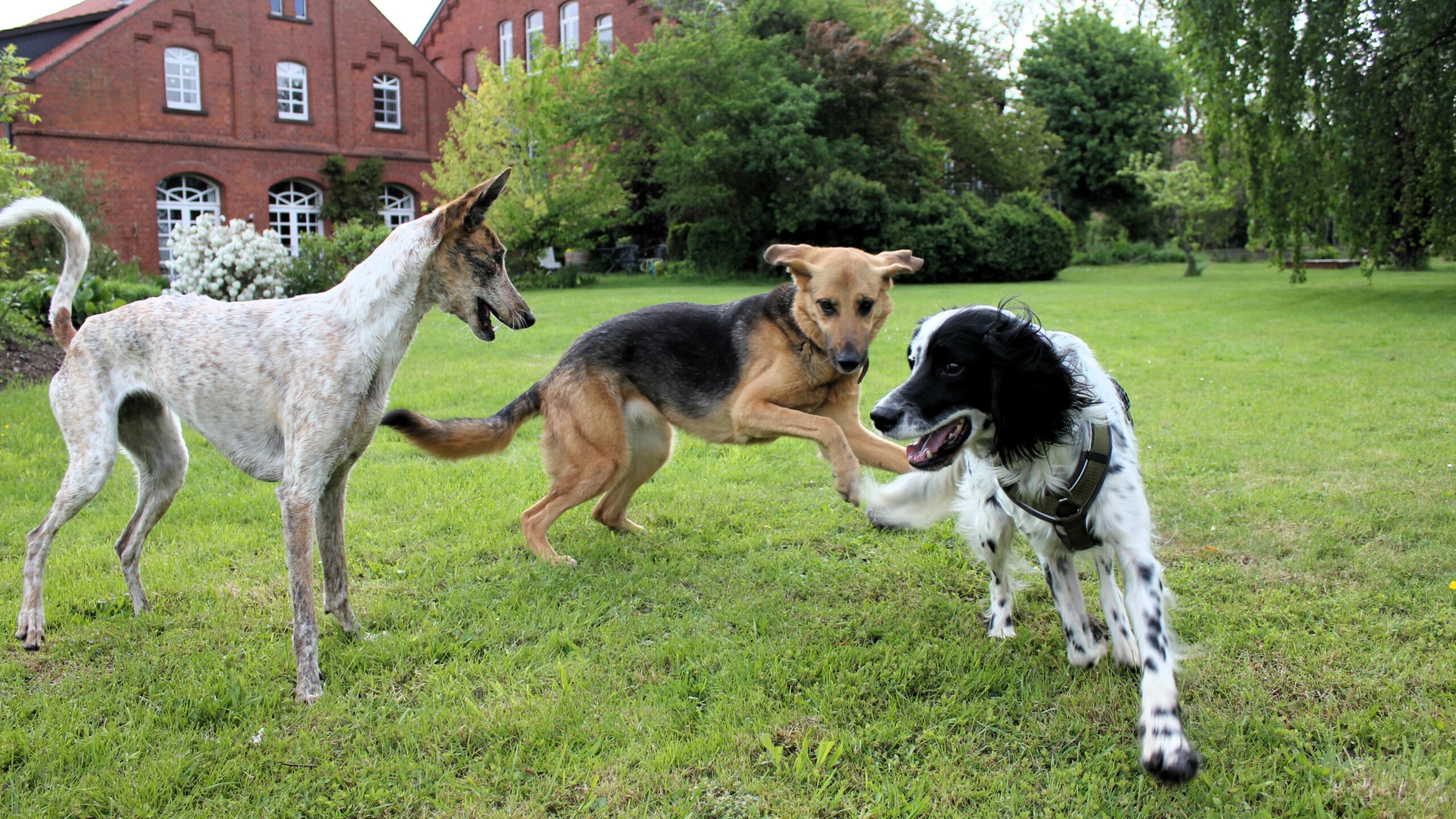 Nach einer Umarmung und kurzen Vorstellung von Ida öffnete ich die Schiebetür – was für ein herrliches Gefühl, die Hunde einfach rennen zu lassen! Und das taten sie – Kala und Ben verstanden sich prächtig und nutzten sofort die gesamte Länge des Grundstücks aus. Auch Amber streckte den langen Körper im Galopp, Augen genussvoll geschlossen, Glück ins Gesicht geschrieben.